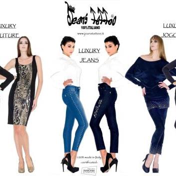 """JEANS TATTOO"" La storia JeansTattoo è un marchio nato con l'idea rivoluzionaria di fare alta moda in jeans (oggi e' Total-look). L'idea che si può avere del jeans è stata sconvolta, ribaltata, rinnovata ……. il capo in denim si prepara ad entrare nelle boutique ricoprendosi di eleganza e sontuosità. Esso perde la sua anima streetwear acquistandone una luxury-fashion! Lo spirito fortemente innovativo , la grande apertura mentale dei fondatori ,la sapienza e qualita' del (100%) made in Italy ,hanno contribuito ben presto ad un rapido sviluppo dell'attività sul mercato. Il suo nome è diventato riconoscibile grazie alla particolarità delle applicazioni di strass esclusivamente Swarovski ,grazie alla qualita' del Made in Italy (dai tessuti alla manifattura) e grazie alla specializzazione nella vestibilità . Lo sviluppo Per alcune stagioni la casa è rimasta legata al concetto del jeans; nel 2010, ha lanciato il primo segnale di espansione verso un total-look firmato JeansTattoo, non piu' realizzato esclusivamente in denim ma anche con tessuti pregiati delle migliori case italiane. La specializzazione nei pantaloni della casa JeansTattoo viene presto affiancata da una proposta di guardaroba completo : vengono lanciati i primi tailleur , i leggings la jogging couture con jersey Milano ,felpe e velluti di una qualita' stupefacente. Nascono la maglia in jersey ,anche effetto tricot ,e la camicia JeansTattoo sia in seta stretch che in popeline stretch . Ovviamente tutto prosegue seguendo il leit –motif delle particolarissime applicazioni tipiche ormai di JeansTattoo. Alla ricerca e allo sviluppo di nuovi prodotti vengono dedicate ingenti risorse. Lo stile si impegna costantemente nella ricerca e nell'innovazione per presentare sempre collezioni differenti , nuove e avanti nelle tendenze della moda, pur tenendo fede all'imperativo di mettere sul mercato capi pratici e confortevoli . "Jeans tattoo" lascia già intuire l'idea del nostro jeans inteso come un marchio a fuoco, che esalta il carattere,l'espressione ... la sensualità. Potenziali capi di alta moda sono adattati alla quotidianità per vestire una donna senza età. Il nostro scopo è che ogni capo esprima una propria personalità ed emerga al consumatore a mò di anima gemella... ""JEANS TATTOO"" The History JeansTattoo is a brand born with the revolutionary idea to do haute couture in jeans (now it is a Total-look). We have upset, overturned and renovated the idea you may have about jeans ……. the denim gets ready to enter in boutiques, covering itself with elegance and sumptuousness. It loses its streetwear soul acquiring a fashion one! The extremely innovative spirit and open-mindedness of the company's Founders, the made in Italy 's (100%) learning and quality soon led to the business expanding across the market. Its name soon became recognizable thanks to the particularity of strass' application made only with Swarovski elements, , thanks to made in Italy's' quality (from the raw material to the manufacture) and thanks to its specialization about fit . The development For several years the brand remained linked to its original idea of jeans ; the 2010's saw the first signs of expansion toward a total-look branded JeansTattoo ,made not only with denim but also with fine fabrics from the best italian manufactories. The specialising in slacks of the house JeansTattoo is soon accompanied by a proposal for a complete wardrobe: they launched the first tailleur, jogging couture and leggings realized by Milan jersey, fleece and velvet of amazing quality. Come the shirt in jersey, also knitted effect, and the JeansTattoo blouse that is made both in stretch silk that in stretch poplin. Of course, everything goes according to the leitmotif of the special applications typical of JeansTattoo. It devotes considerable resources in the research and development of new products. The style is constantly engaged in research and innovation to present always different collections , that can be new and in advance respect to the trends of the fashion market ,even remaining faithful to the imperative to input on the market practical and comfortable heads . The name "Jeans tattoo" gives you already an idea of our jeans as a fire mark that exalts character, expression ….. and sensuality. We transfer haute couture into daily life to dress a woman with no age. Our aim is that every piece of wear expresses an own personality and comes to the consumer like made for each other. "