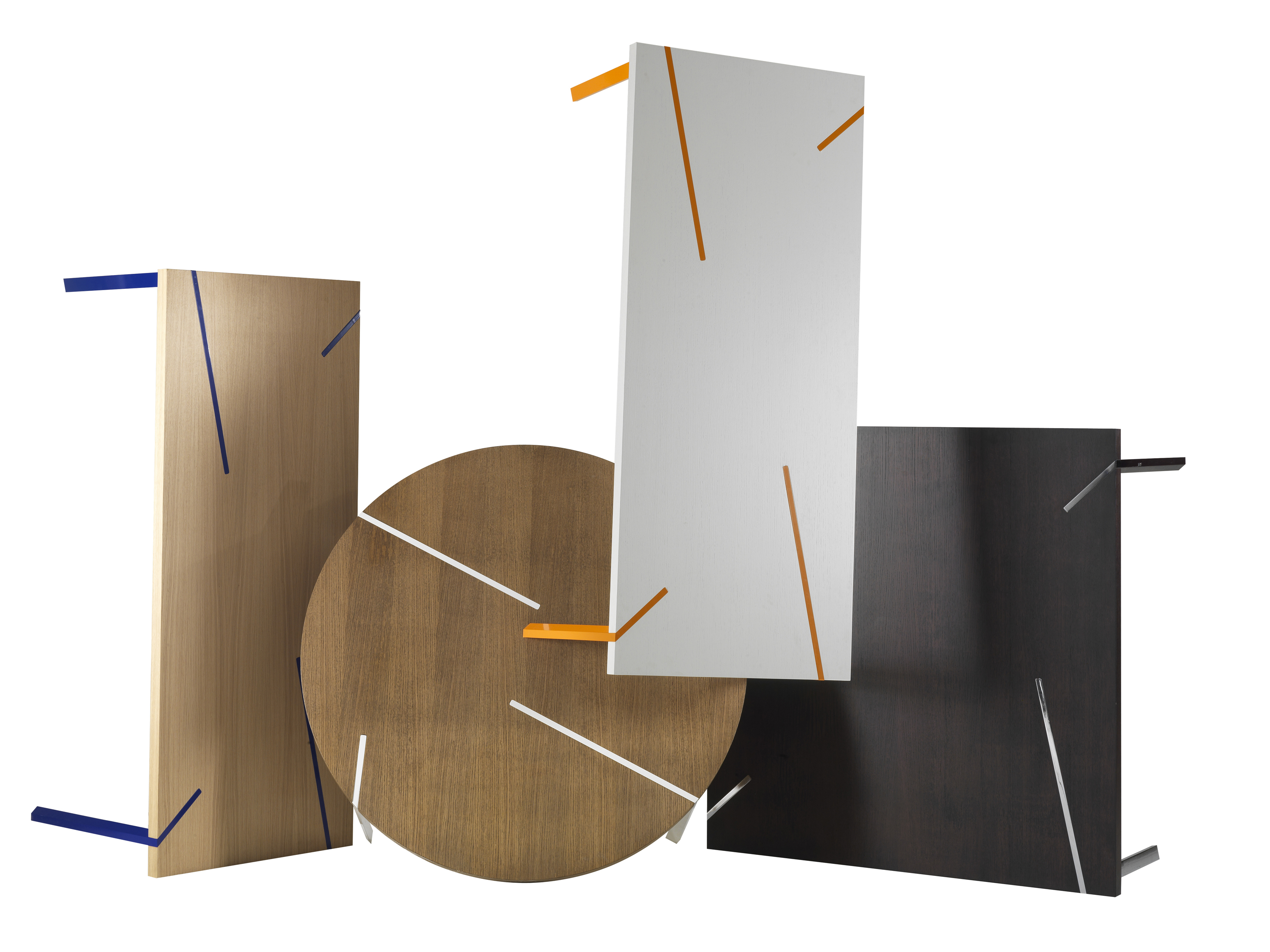 Il loro posizionamento è traslato rispetto agli spigoli, contravvenendo alle regole compositive tradizionali e generando un effetto di apparente asimmetria. Disponibile in diversi formati e finiture, il piano è sagomato per permettere l’innesto delle gambe e diventare corpo unico garantendo grande stabilità e compostezza.