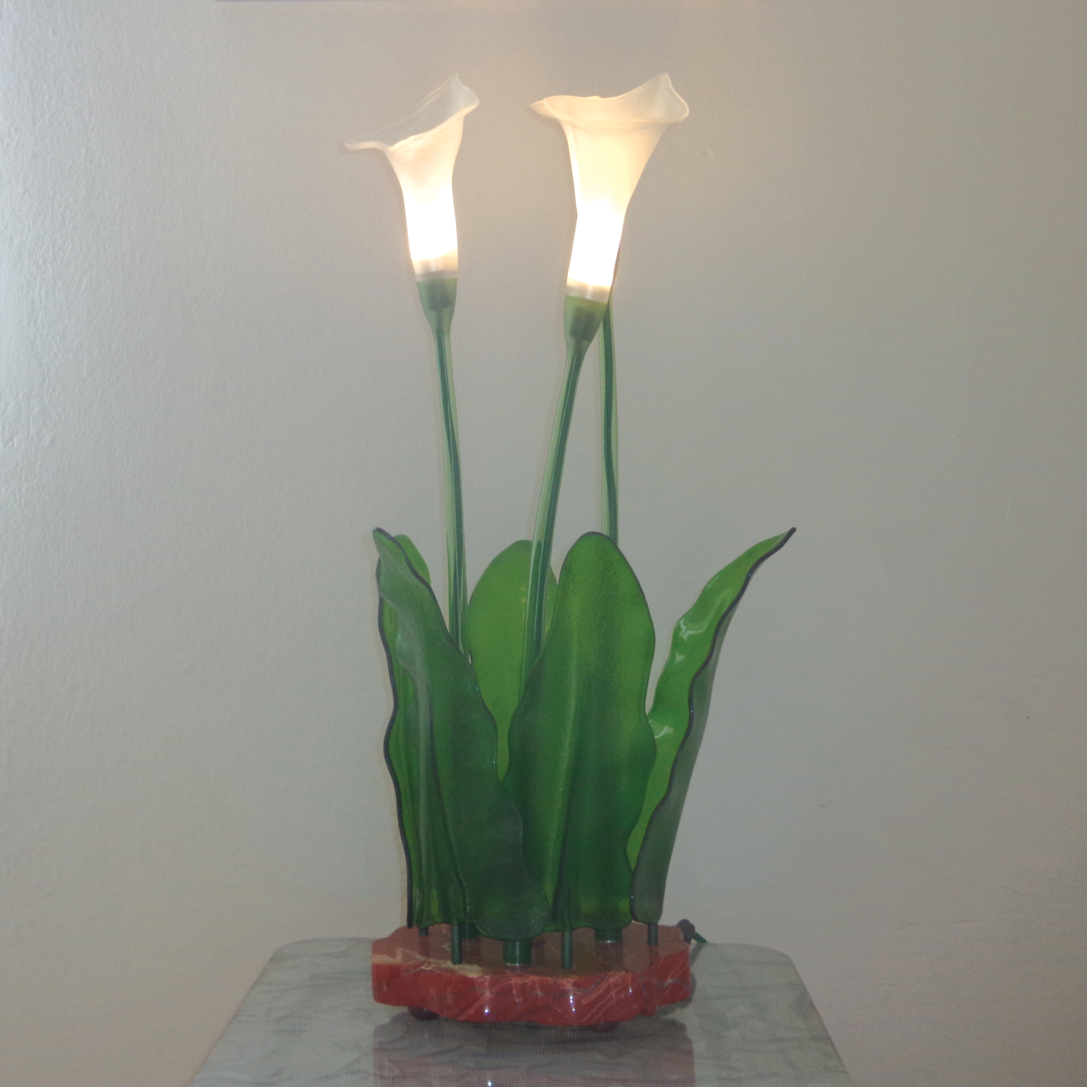 Composizione artistica di fiori bianchi in vetro soffiato, foglie realizzati con vetro di Murano e base in diaspro rosso – pietra dura.