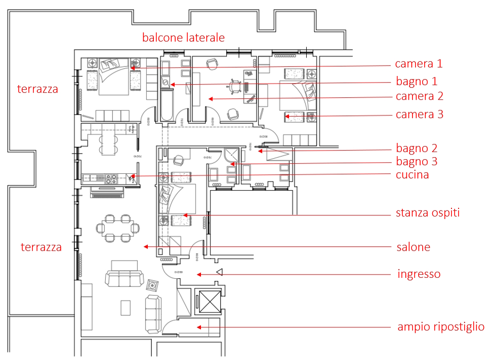 L’appartamento, caratterizzato da soffitti alti 3 metri, accoglie gli ospiti con un ampio ingresso che conduce al salone doppio. La zona notte comprende 3 camere da letto principali e 3 bagni (finiture top level), oltre a una camera/studio indipendente con bagno privato, ideale per ospiti o personale di servizio. Completano la proprietà un balcone tecnico attrezzato con sistema di decalcificazione dell'acqua e lavanderia.