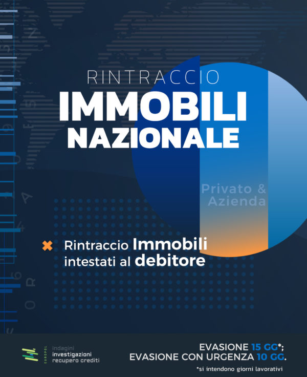 Il Rintraccio Immobili intestati al debitore sul territorio Nazionale viene effettuato online tramite il nostro e-commerce investigativo e consente di risalire a qualunque immobile in proprietà al debitore, ovunque esso sia sito in Italia. Puoi usufruire del servizio comodamente dal tuo pc o tablet ed avere online tutto ciò che ti serve per scoprire quali sono i beni immobili intestati al debitore.