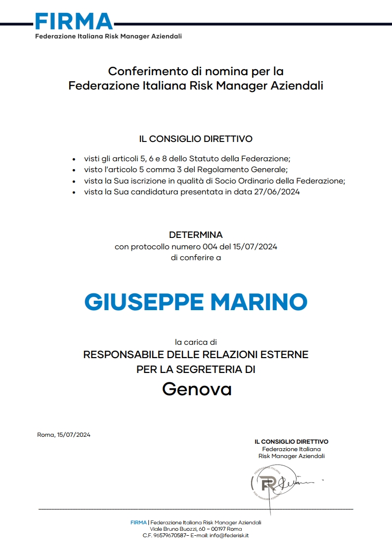 📢 Siamo lieti di annunciare che siamo stati ufficialmente nominati come Segreteria Provinciale FIRMA (Federazione Italiana Risk Manager Aziendali) per Genova, con Vittorio Brambilla nel ruolo di Segretario Provinciale! 🎉